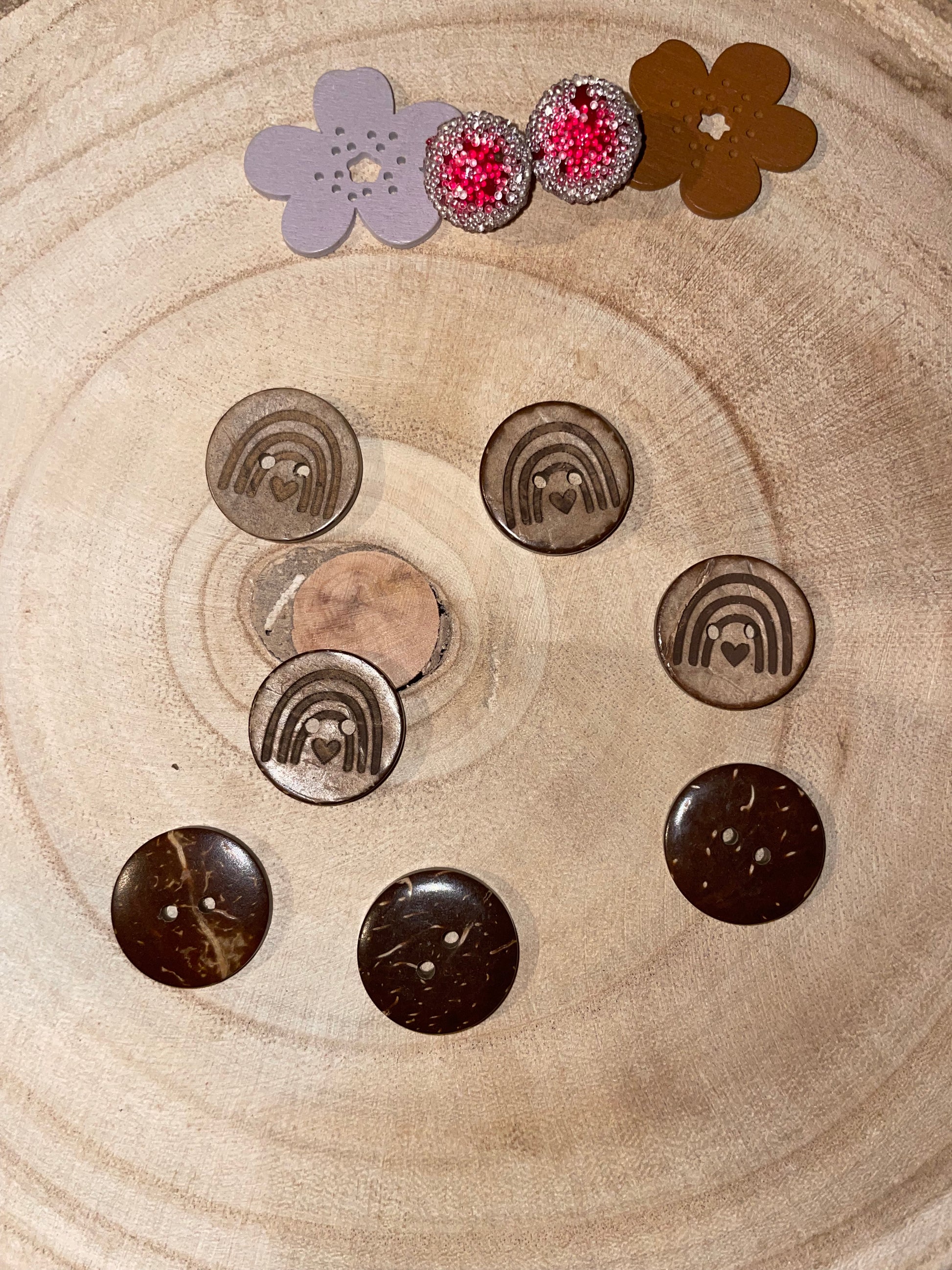 Die Kokosknöpfe werden aus der Schale der Kokosnuss gemacht und sind aufgrund ihres natürlichen Materials sehr unterschiedlich. Es kann in der Produktion sowohl zu unterschiedlich intensiven Gravuren, zu Farbabweichungen, als auch zu Kratzern und Rillen auf der Oberfläche kommen.